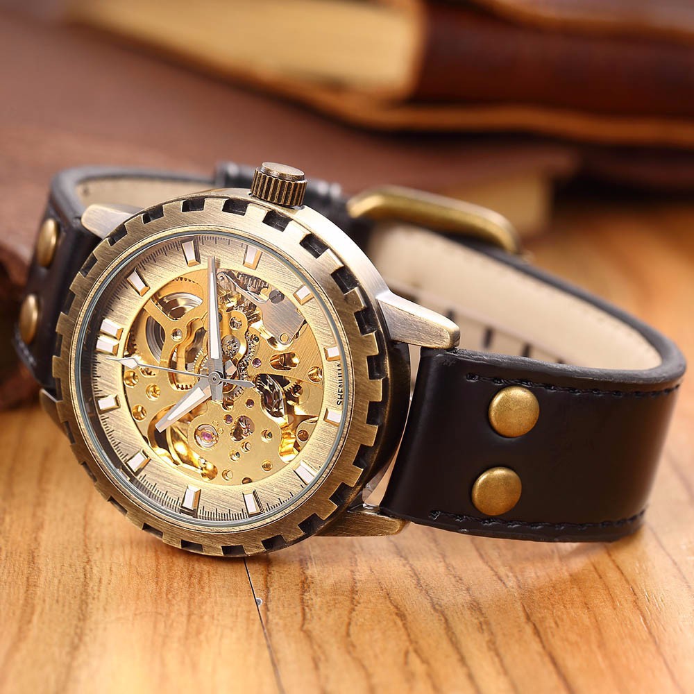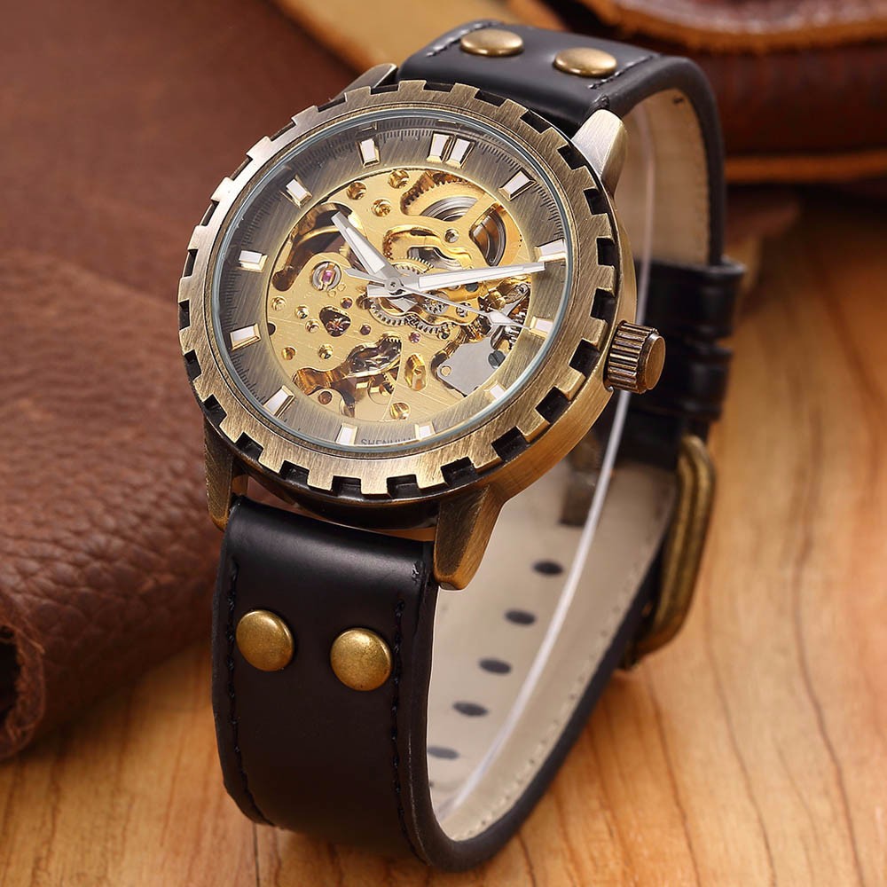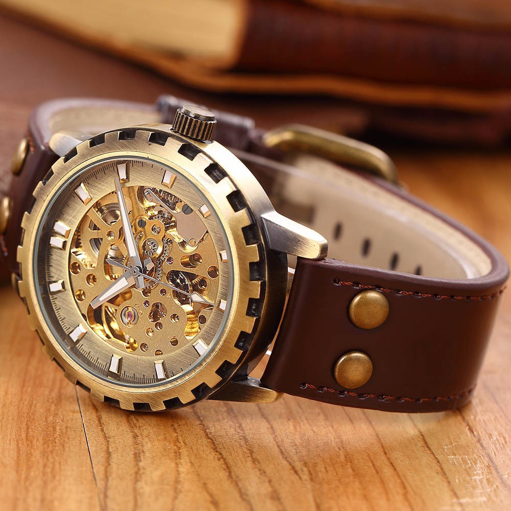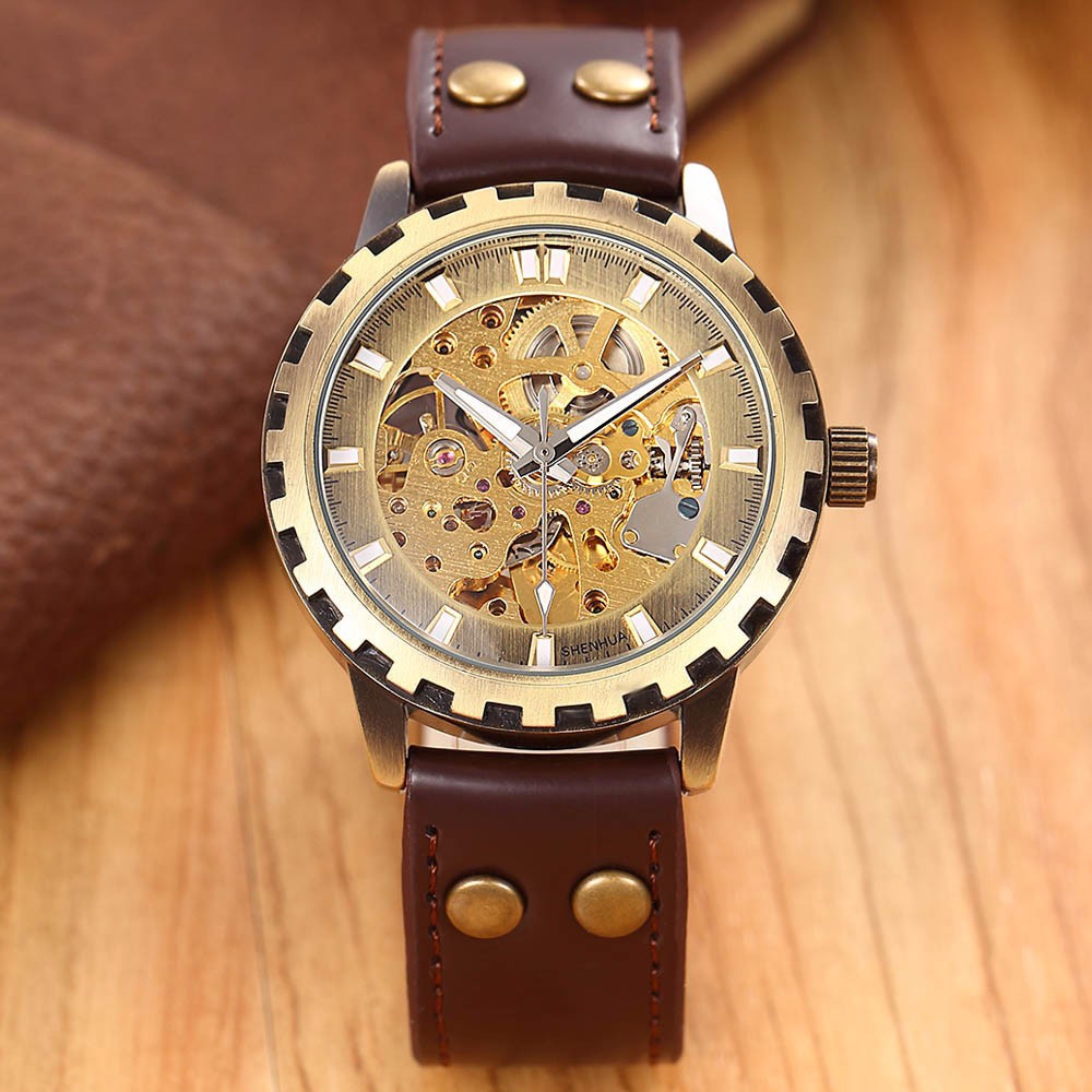 Relógio Masculino, De Pulseira De Couro, Com Movimento Mecânico Automático, Esquelético De Qualidade - Q1
