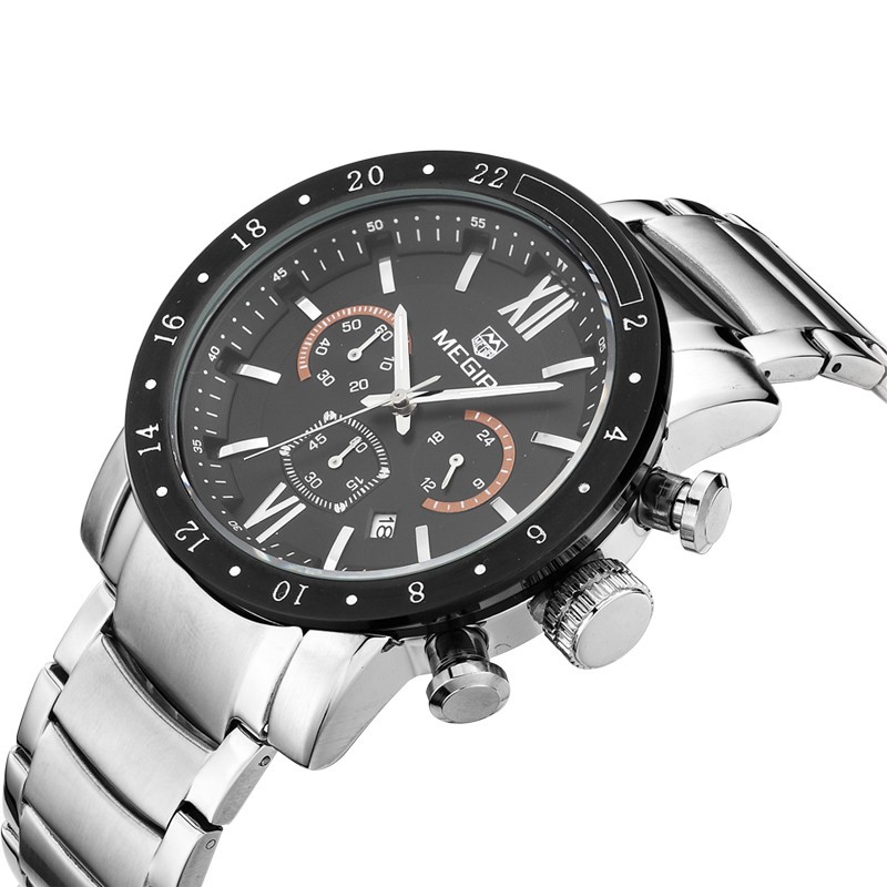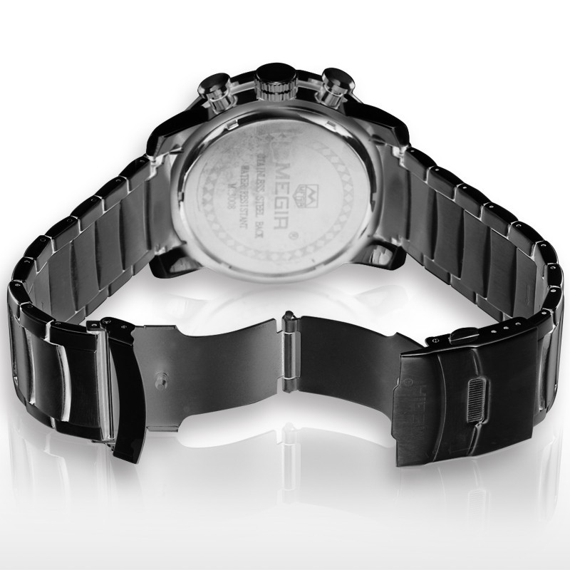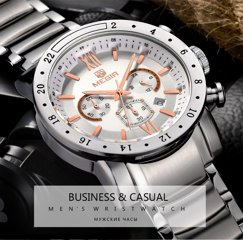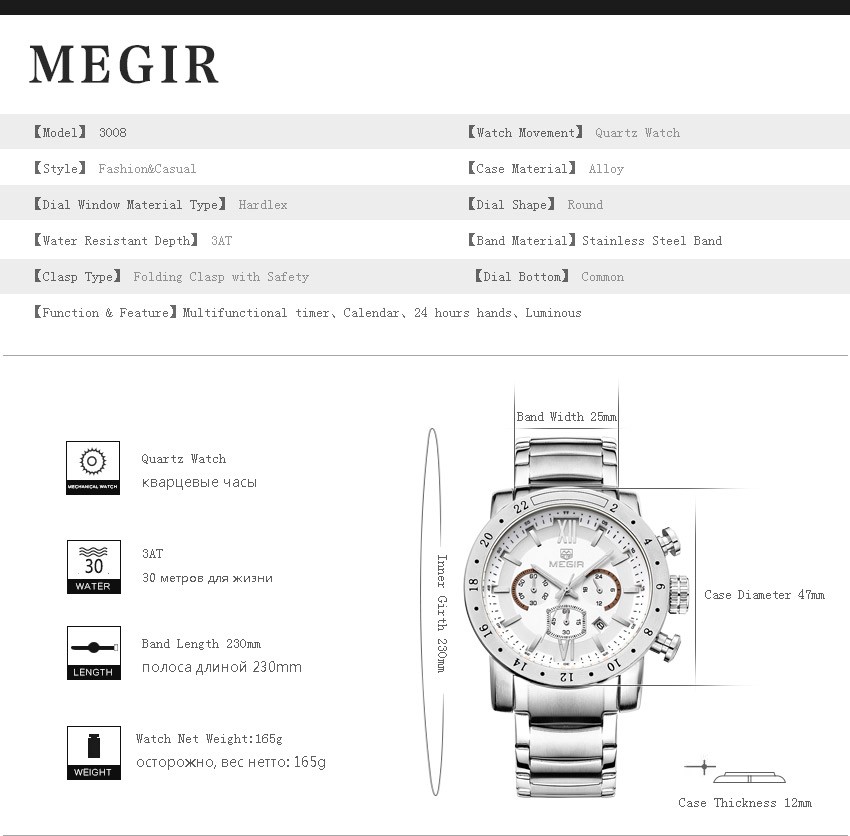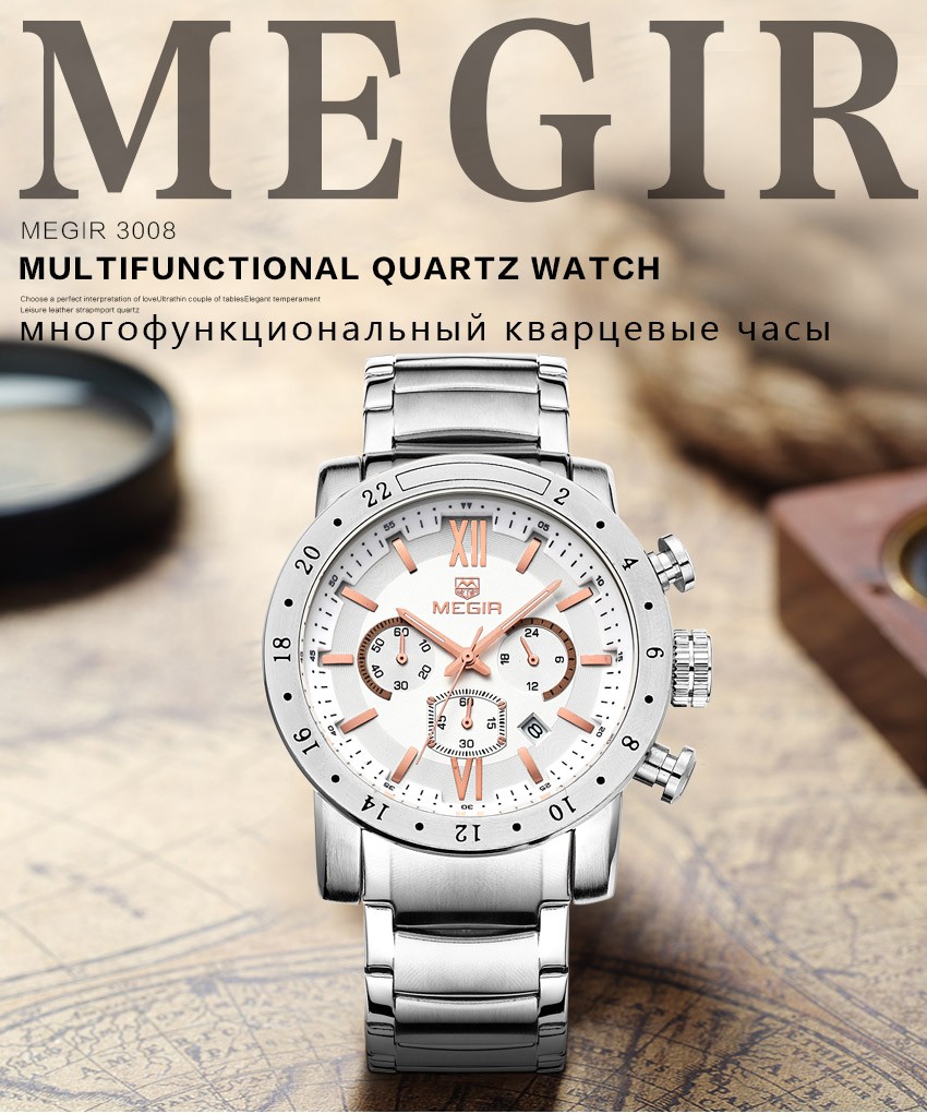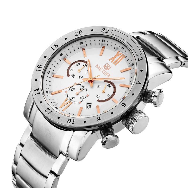 Relógio Masculino Marca, MEGIR-3008G, Em Aço Inox, Chronograph, Calendário Inoxidável, Movimento De Quartzo